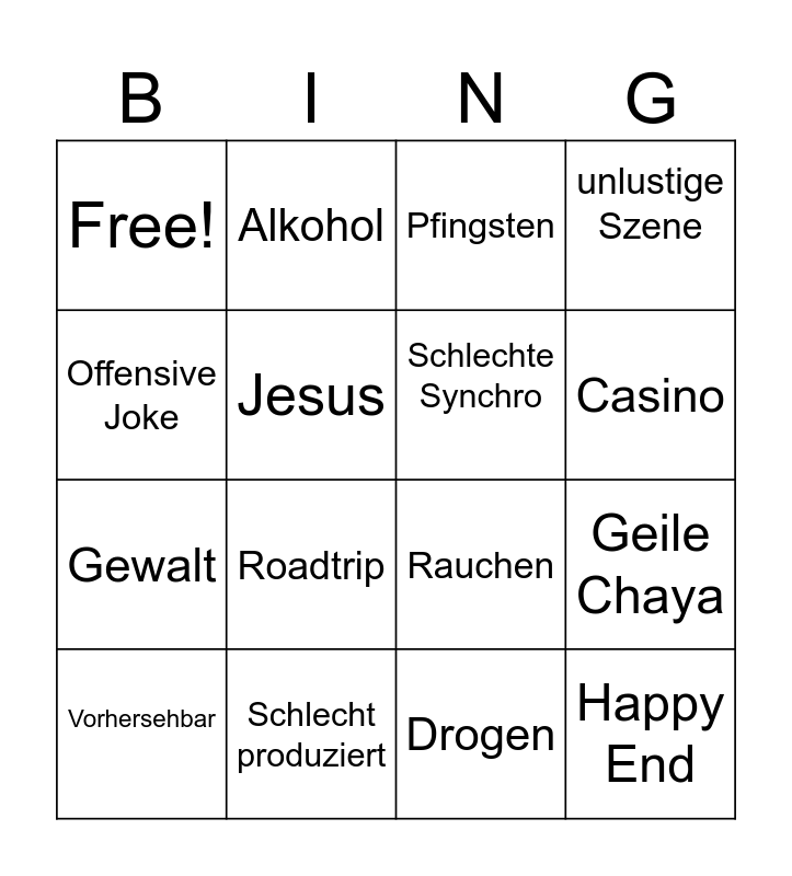 This bingo card has 16 words: Vorhersehbar, Schlecht produziert, Pfingsten, unlustige Szene, Offensive Joke, Alkohol, Rauchen, Geile Chaya, Free!, Jesus, Drogen, Casino, Gewalt, Roadtrip, Schlechte Synchro and Happy End.