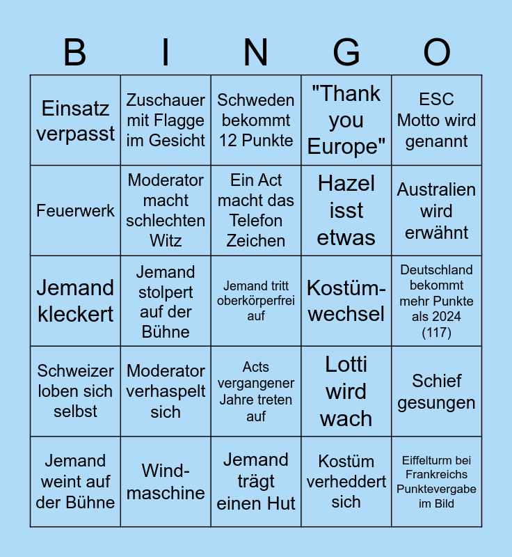This bingo card has a free space and 24 words: Moderator verhaspelt sich, Wind-maschine, Ein Act macht das Telefon Zeichen, Jemand weint auf der Bühne, ESC Motto wird genannt, Einsatz verpasst, Feuerwerk, Zuschauer mit Flagge im Gesicht, Kostüm- wechsel, Acts vergangener Jahre treten auf, Hazel isst etwas, Jemand kleckert, Lotti wird wach, Schief gesungen, Moderator macht schlechten Witz, Kostüm verheddert sich, Deutschland bekommt mehr Punkte als 2024 (117), Schweden bekommt 12 Punkte, Australien wird erwähnt, Jemand stolpert auf der Bühne, Eiffelturm bei Frankreichs Punktevergabe im Bild, Schweizer loben sich selbst, "Thank you Europe" and Jemand trägt einen Hut.