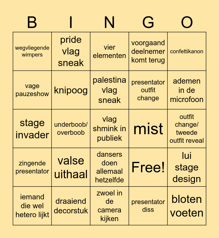 This bingo card has 25 words: valse uithaal, zwoel in de camera kijken, palestina vlag sneak, iemand die wel hetero lijkt, confettikanon, wegvliegende wimpers, vage pauzeshow, pride vlag sneak, mist, dansers doen allemaal hetzelfde, presentator outfit change, stage invader, Free!, lui stage design, knipoog, bloten voeten, outfit change/ tweede outfit reveal, vier elementen, ademen in de microfoon, underboob/ overboob, vlag shmink in publiek, draaiend decorstuk, zingende presentator, voorgaand deelnemer komt terug and presentator diss.