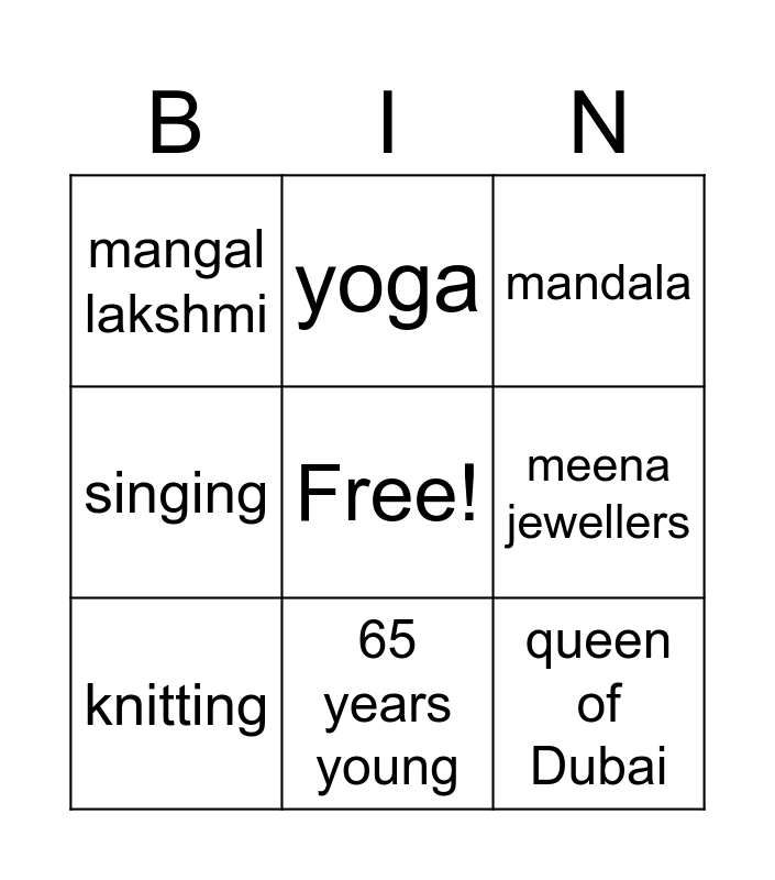 This bingo card has a free space and 9 words: knitting, mandala, yoga, singing, mangal lakshmi, meena jewellers, queen of Dubai, 20th May and 65 years young.