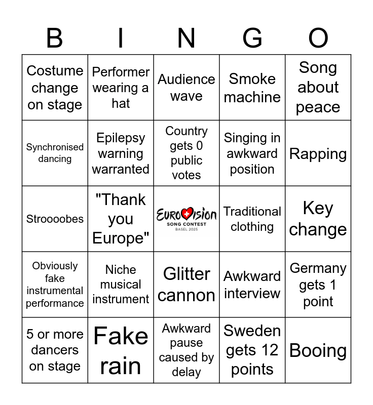 This bingo card has a free space and 43 words: Singing in native language, Booing, Intro video includes a waterfall or windmill, 5 or more dancers on stage, Weird or oversized prop, Sweden gets 12 points, Audience wave, Pride flag / rainbow colours, Song about peace, Fake rain, Smoke machine, Traditional clothing, Glitter cannon, Niche musical instrument, Germany places last, Awkward pause caused by delay, Fire, Stroooobes, Wink at the camera, Rapping, Performer wearing a hat, Someone falls over, Hosts start singing, Costume change on stage, Host changes costume, Key change, Water, Men dancing in heels, Awkward interview, Obviously fake instrumental performance, Creatief me met kurk, Germany gets 1 point, Dubious english pronunciation, "Thank you Europe", "Hello Europe!", Points given not in english, "Surprise" act by Nemo, Country gets 0 public votes, Synchronised dancing, Singing in awkward position, Heart hands, Epilepsy warning warranted and Multi-lingual song.