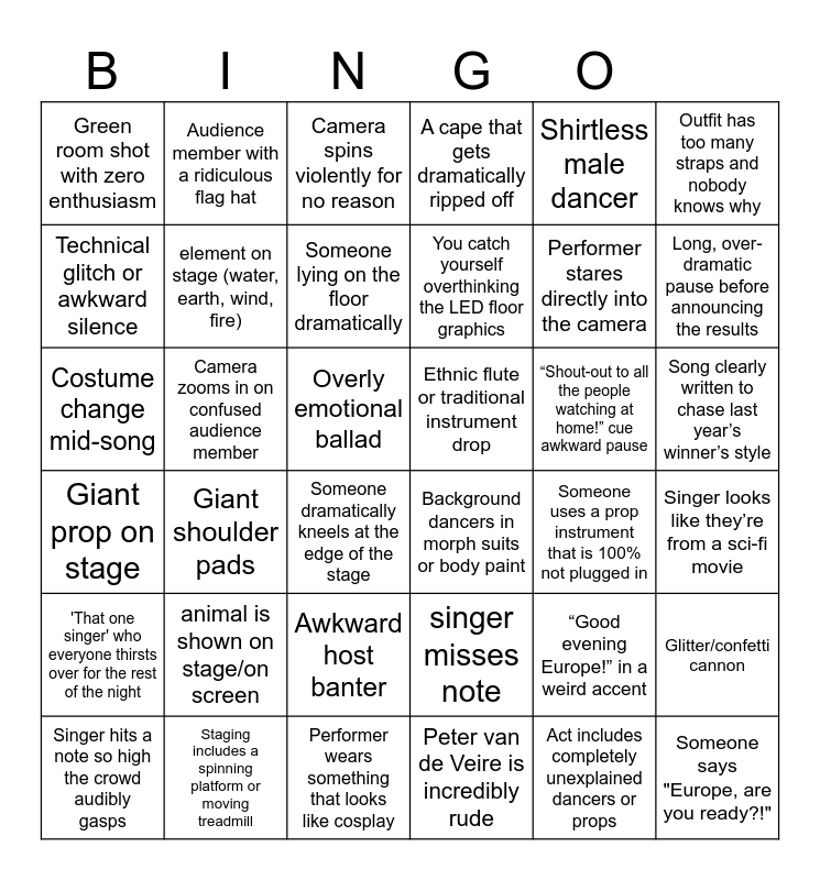 This bingo card has 36 words: singer misses note, Awkward host banter, Peter van de Veire is incredibly rude, Technical glitch or awkward silence, Giant prop on stage, Ethnic flute or traditional instrument drop, element on stage (water, earth, wind, fire), Performer wears something that looks like cosplay, Shirtless male dancer, “Good evening Europe!” in a weird accent, Long, over-dramatic pause before announcing the results, A cape that gets dramatically ripped off, Glitter/confetti cannon, Camera zooms in on confused audience member, You catch yourself overthinking the LED floor graphics, Green room shot with zero enthusiasm, 'That one singer' who everyone thirsts over for the rest of the night, “Shout-out to all the people watching at home!” cue awkward pause, Costume change mid-song, Camera spins violently for no reason, Overly emotional ballad, Giant shoulder pads, Background dancers in morph suits or body paint, Someone dramatically kneels at the edge of the stage, Someone uses a prop instrument that is 100% not plugged in, Audience member with a ridiculous flag hat, Performer stares directly into the camera, Staging includes a spinning platform or moving treadmill, Someone lying on the floor dramatically, Outfit has too many straps and nobody knows why, Someone says "Europe, are you ready?!", Singer hits a note so high the crowd audibly gasps, Singer looks like they’re from a sci-fi movie, Song clearly written to chase last year’s winner’s style, animal is shown on stage/on screen and Act includes completely unexplained dancers or props.