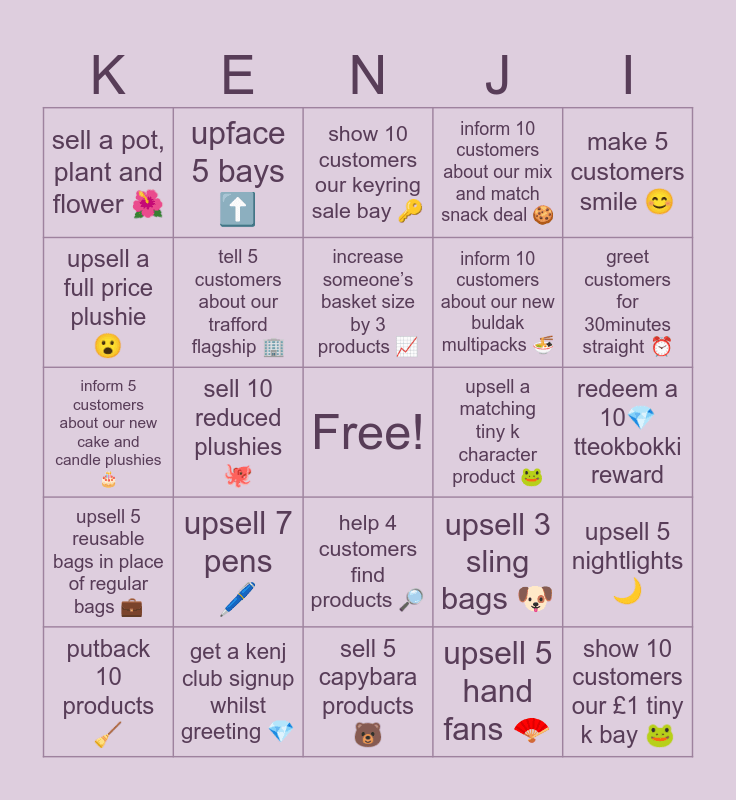 This bingo card has a free space and 24 words: upsell 7 pens ๐๏ธ, get a kenj club signup whilst greeting ๐, increase someoneโs basket size by 3 products ๐, putback 10 products ๐งน, make 5 customers smile ๐, sell a pot, plant and flower ๐บ, upsell a full price plushie ๐ฎ, upface 5 bays โฌ๏ธ, upsell a matching tiny k character product ๐ธ, help 4 customers find products ๐, inform 10 customers about our new buldak multipacks ๐, inform 5 customers about our new cake and candle plushies ๐, upsell 3 sling bags ๐ถ, upsell 5 nightlights ๐, tell 5 customers about our trafford flagship ๐ข, upsell 5 hand fans ๐ชญ, redeem a 10๐ tteokbokki reward, show 10 customers our keyring sale bay ๐, greet customers for 30minutes straight โฐ, sell 10 reduced plushies ๐, show 10 customers our ยฃ1 tiny k bay ๐ธ, upsell 5 reusable bags in place of regular bags ๐ผ, inform 10 customers about our mix and match snack deal ๐ช and sell 5 capybara products ๐ป.