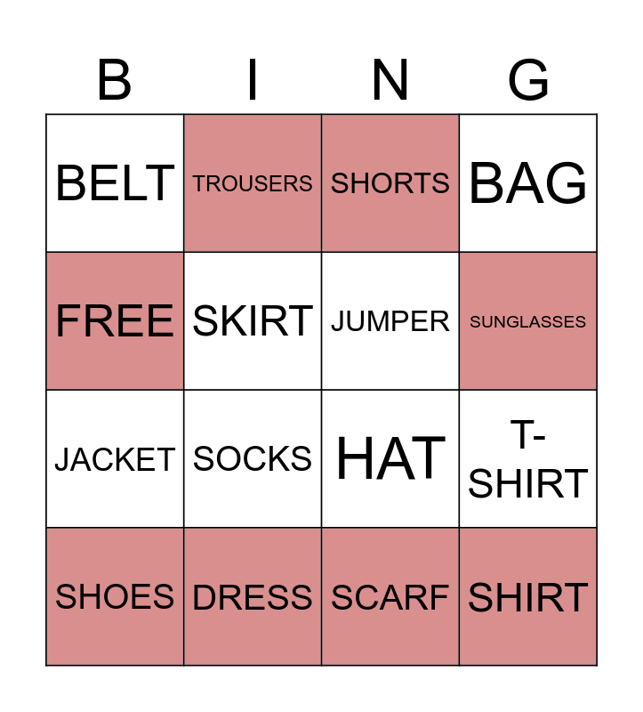 This bingo card has 16 words: DRESS, T-SHIRT, SHORTS, BELT, JACKET, TROUSERS, HAT, SCARF, FREE, SKIRT, SHOES, BAG, SOCKS, SUNGLASSES, JUMPER and SHIRT.