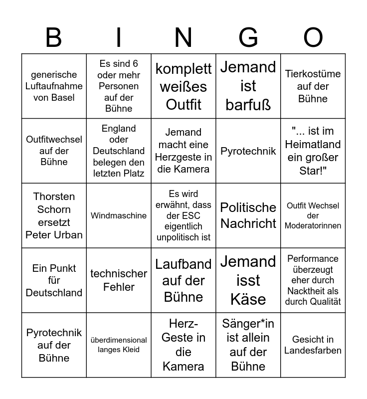 This bingo card has 38 words: Es wird erwähnt, dass Thorsten Schorn Peter Urban ersetzt., Song, in dem mindestens zwei Sprachen vorkommen, ABBA wird erwähnt, England oder Deutschland belegen den letzten Platz, Performance überzeugt eher durch Nacktheit als durch Qualität, technischer Fehler, Jemand macht eine Herzgeste in die Kamera, Nebelmaschine, Tierkostüme auf der Bühne, Pyrotechnik, Windmaschine, Jemand ist barfuß, Es wird erwähnt, dass der ESC eigentlich unpolitisch ist, Outfit Wechsel der Moderatorinnen, Outfitwechsel auf der Bühne, Ein Punkt für Deutschland, "...ist im Heimatland ein großer Star!", komplett weißes Outfit, Glitzeroutfit, Politische Nachricht, generische Luftaufnahme von Basel, überdimensional langes Kleid, "... ist im Heimatland ein großer Star!", Pyrotechnik auf der Bühne, 12 Punkte für Deutschland, Herz-Geste in die Kamera, Gesicht in Landesfarben, Es wird eine Burg gezeigt, Absurder Gastauftritt, Es wird über Sport geredet, Es wird erklärt, warum Australien teilnimmt., Laufband auf der Bühne, Sänger*in ist allein auf der Bühne, Es sind 6 oder mehr Personen auf der Bühne, Buh-Rufe aus dem Publikum, Jemand isst Käse, Thorsten Schorn ersetzt Peter Urban and ".