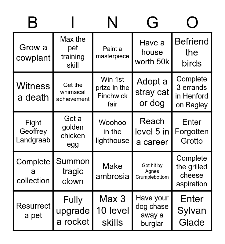 This bingo card has 25 words: Summon tragic clown, Max 3 10 level skills, Win 1st prize in the Finchwick fair, Resurrect a pet, Befriend the birds, Grow a cowplant, Witness a death, Max the pet training skill, Reach level 5 in a career, Make ambrosia, Adopt a stray cat or dog, Fight Geoffrey Landgraab, Get hit by Agnes Crumplebottom, Complete the grilled cheese aspiration, Get the whimsical achievement, Enter Sylvan Glade, Enter Forgotten Grotto, Paint a masterpiece, Complete 3 errands in Henford on Bagley, Get a golden chicken egg, Woohoo in the lighthouse, Fully upgrade a rocket, Complete a collection, Have a house worth 50k and Have your dog chase away a burglar.