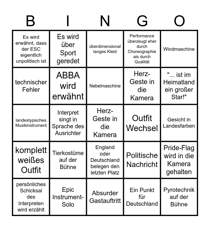 This bingo card has 35 words: Interpret singt kopfüber, Song, in dem mindestens zwei Sprachen vorkommen, Videoeffekt auf der Bühne mit Sänger, ABBA wird erwähnt, England oder Deutschland belegen den letzten Platz, Performance überzeugt eher durch Choreographie als durch Qualität, technischer Fehler, Jemand macht eine Telefongeste in die Kamera, Nebelmaschine, Frau in dramatischen Kleid singt Ballade, landestypisches Musikinstrument, Windmaschine, Jemand ist barfuß, Tonartwechsel, Es wird erwähnt, dass der ESC eigentlich unpolitisch ist, Outfit Wechsel, Ein Punkt für Deutschland, Interpret singt in Sprache des Ausrichter, komplett weißes Outfit, Herz-Geste in die Kamera, Politische Nachricht, persönliches Schicksal des Interpreten wird erzählt, Pride-Flag wird in die Kamera gehalten, Epic Instrument-Solo, überdimensional langes Kleid, "... ist im Heimatland ein großer Star!", Pyrotechnik auf der Bühne, 12 Punkte für Deutschland, Herz-Geste in die Kamera, Gesicht in Landesfarben, Es wird eine Burg gezeigt, Absurder Gastauftritt, Tierkostüme auf der Bühne, Es wird über Sport geredet and Es wird erklärt, warum Australien teilnimmt.