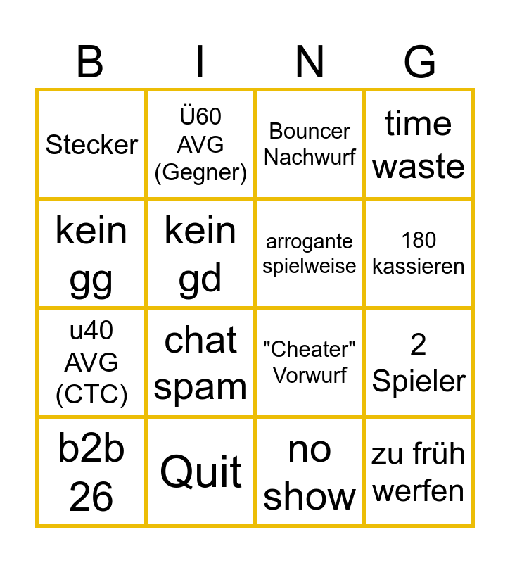 This bingo card has 16 words: Quit, 2 Spieler, Bouncer Nachwurf, Stecker, u40 AVG (CTC), Ü60 AVG (Gegner), "Cheater" Vorwurf, no show, kein gg, kein gd, b2b 26, time waste, chat spam, 180 kassieren, arrogante spielweise and zu früh werfen.