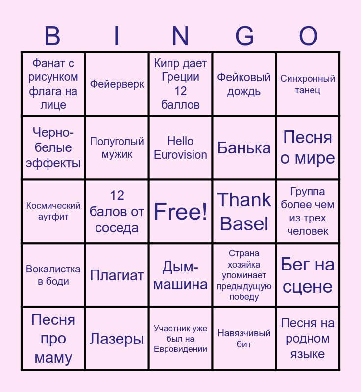 This bingo card has a free space and 52 words: Песня на двух языках, Песня на родном языке, Задержка трансляции при объявлении баллов, Участник уже был на Eвровидении, Плагиат, Пиротехника, Фейерверк, Ветровая машина, Черно-белые эффекты, Полет, Полуголый мужик, Драматическое приближение камеры, Бег на сцене, Страна хозяйка упоминает предыдущую победу, «nul points», Дракон, Hello Eurovision, Thank Basel, Good morning Australia, Синхронный танец, 12 балов от соседа, Навязчивый бит, Фанат с рисунком флага на лице, Банька, Кто-то в шляпе, Диско-шар, Страна не из Европы, Смена костюма в середине песни, Песня о мире, Песня о любви, Кто-то из большой пятерки получает 0 баллов от жюри, Фейковый дождь, Освистывание, Животное в кадре, Страна получает 12 баллов 2 раза подряд, Кипр дает Греции 12 баллов, Лазеры, Высокая нота, Оперное пение, Зритель подпевает в кадре, Появление участников прошлых лет, Группа более чем из трех человек, Вокалистка в боди, Выбеленные волосы, Дым-машина, Ла-ла-ла, Камера на 360°, Космический аутфит, Швейцарские горы, Национальный костюм, Песня про маму and Неожиданное голосование зрителей.