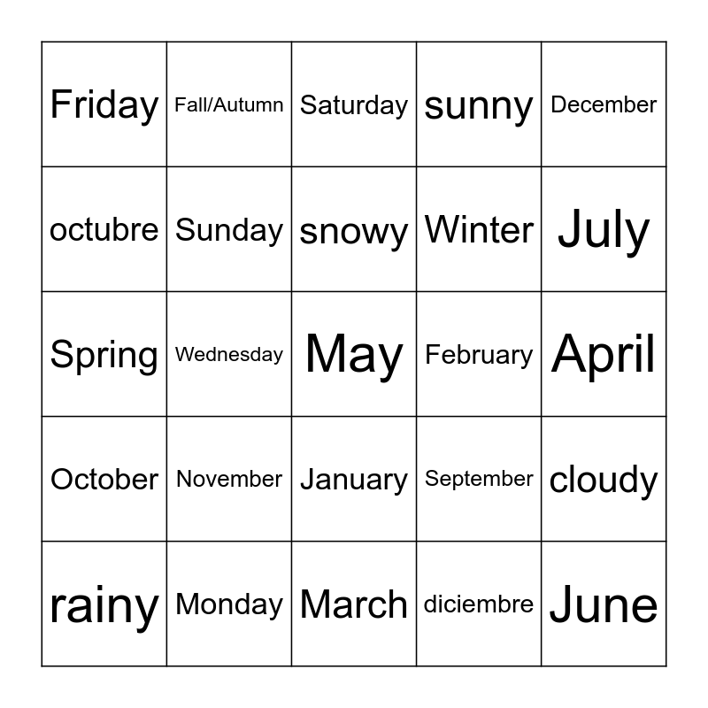 This bingo card has 30 words: Monday, Tuesday, Wednesday, Thursday, Friday, Saturday, Sunday, January, February, March, April, May, diciembre, June, July, August, September, October, November, December, Spring, Summer, Fall/Autumn, Winter, octubre, sunny, cloudy, rainy, snowy and stormy.