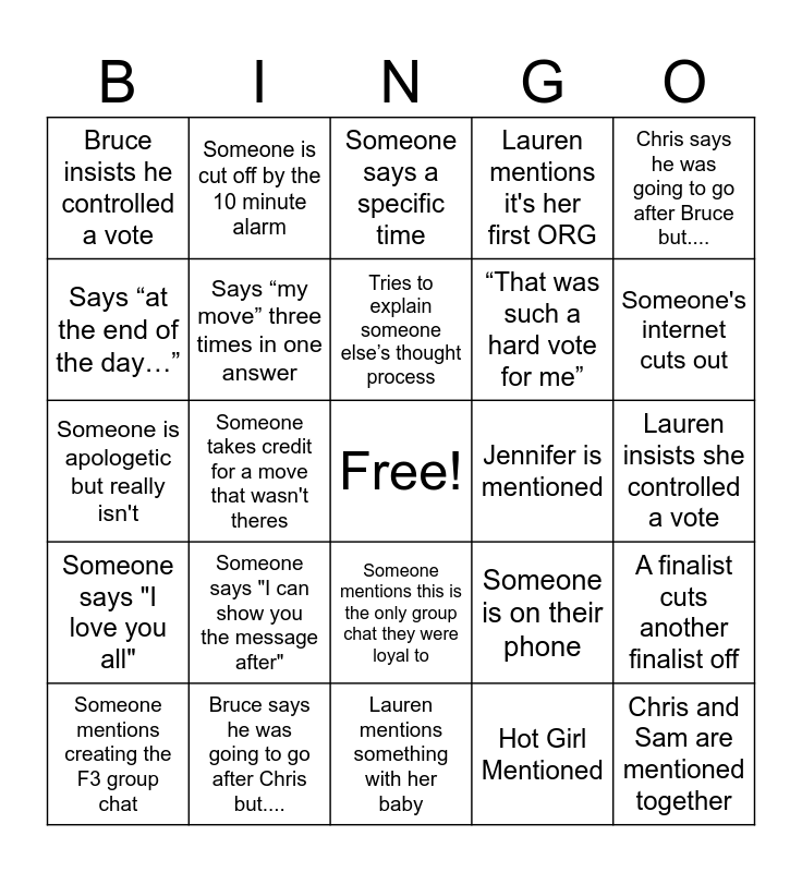 This bingo card has a free space and 44 words: Bruce and Jonah are mentioned together, Chris and Sam are mentioned together, Lauren is challenged on her strategic game, Someone mentions creating the F3 group chat, Bruce is cocky, Hot Girl Mentioned, Someone says a specific time, Bitter Jury is mentioned, Chris says he was going to go after Bruce but...., Bruce says he was going to go after Chris but...., Lauren mentions it's her first ORG, Jennifer is mentioned, Someone mentions this is the only group chat they were loyal to, Someone says "I can show you the message after", Bruce makes sports analogy, Lauren mentions something with her baby, Chris mentions his previous relationships, Someone is apologetic but really isn't, Someone says (insert jury member name) 's vote was the hardest, Someone's internet cuts out, Someone is cut off by the 10 minute alarm, Bruce and Chris argue, Someone avoids the question all together, Bruce insists he controlled a vote, Chris insists he controlled a vote, Lauren insists she controlled a vote, Chris claps his hands, Someone is in formal dress, Someone is on their phone, Someone says "I love you all", Someone says "best for my game", A finalist cuts another finalist off, Someone says that a member of the jury was their #1, Someone incorrectly states a jury member was a threat to their game, Someone takes credit for a move that wasn't theres, I controlled every vote, Says “social game” without giving a single example, “I didn’t want to vote you out…”, Tries to explain someone else’s thought process, Says “at the end of the day…”, “That was such a hard vote for me”, Blames someone else for a move they clearly made, Says “my move” three times in one answer and “I knew exactly what was going to happen”.