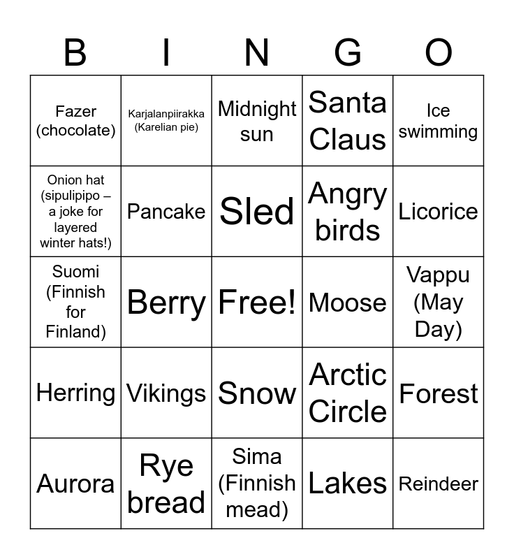 This bingo card has a free space and 45 words: Sauna, Reindeer, Moomin, Aurora, Sisu, Lakes, Midnight sun, Helsinki, Ice swimming, Rye bread, Santa Claus, Moose, Snow, Vikings, Lapland, Sima (Finnish mead), Finlandia, Suomi (Finnish for Finland), Kalevala (Finnish epic), Licorice, Karjalanpiirakka (Karelian pie), Salty licorice, Marimekko, Fazer (chocolate), Salmiakki (salty licorice), Vappu (May Day), Joulupukki (Finnish Santa Claus), Lappish knife, Arctic Circle, Herring, Bear, Forest, Ice, Mökki (cottage), Coffee, Berry, Cloudberry, Wool socks, Snowman, Sled, Onion hat (sipulipipo – a joke for layered winter hats!), Angry birds, Quiet, Pancake and Ice hockey.