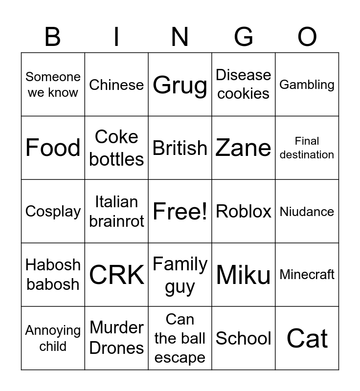 This bingo card has a free space and 24 words: CRK, Murder Drones, British, Annoying child, Gambling, Someone we know, Food, Chinese, Roblox, Family guy, Zane, Cosplay, Miku, Minecraft, Coke bottles, School, Niudance, Grug, Final destination, Italian brainrot, Cat, Habosh babosh, Disease cookies and Can the ball escape.