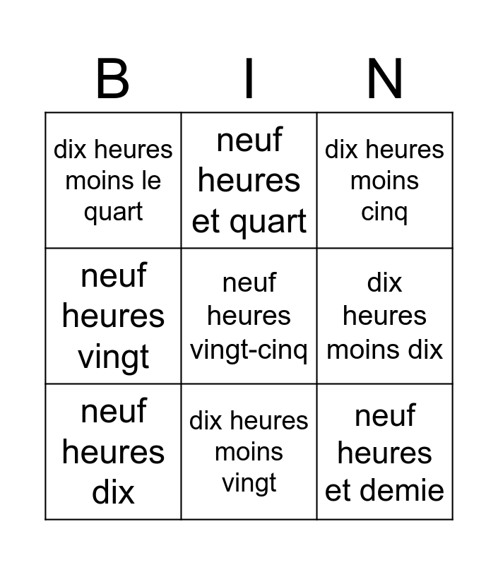 LES HEURES (N-F) | Bingo de l'heure | Bingo de l'heure | Quelle heure est-il? | Les numéros et l'heure 2