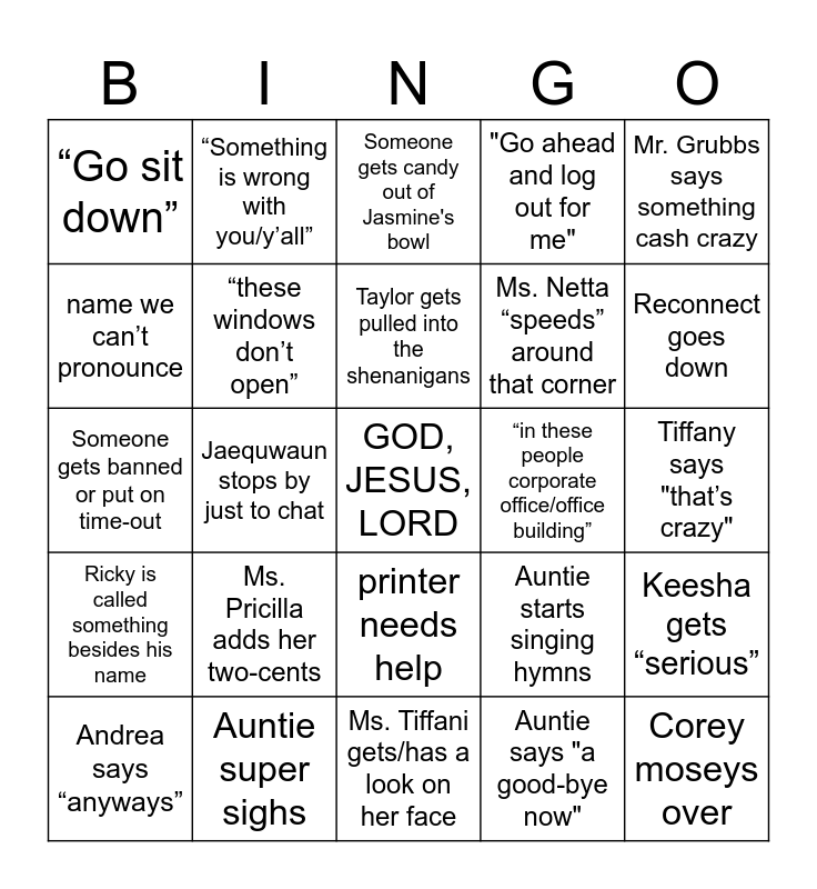 This bingo card has a free space and 24 words: Ms. Pricilla adds her two-cents, Auntie super sighs, Taylor gets pulled into the shenanigans, Andrea says “anyways”, Mr. Grubbs says something cash crazy, “Go sit down”, name we can’t pronounce, “Something is wrong with you/y’all”, “in these people corporate office/office building”, printer needs help, Ms. Netta “speeds” around that corner, Someone gets banned or put on time-out, Auntie starts singing hymns, Keesha gets “serious”, “these windows don’t open”, Auntie says "a good-bye now", Tiffany says "that’s crazy", Someone gets candy out of Jasmine's bowl, Reconnect goes down, Jaequwaun stops by just to chat, Corey moseys over, Ricky is called something besides his name, "Go ahead and log out for me" and Ms. Tiffani gets/has a look on her face.