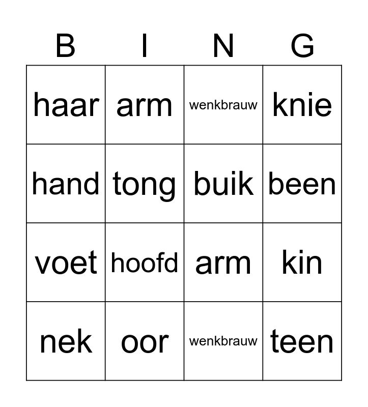 ⚠ This card has duplicate items: oog (2), neus (2), oor (2), schouder (2), mond (2), buik (2), rug (2), arm (2), voet (2), been (2), hand (2), vinger (2), tand (2), haar (2), nek (2), knie (3), teen (2), kin (2), tong (2), wenkbrauw (2)