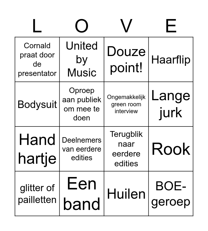 This bingo card has 43 words: Hello Europe!, glitter of pailletten, kledingwissel presentator, Thank you Europe!, Vlag als cape, Politiek statement, Douze point!, Vuur, Bodysuit, Kushandje, Haarflip, Een band, Shaming van Cornald, Valse zang, Artiest is buiten adem, Achtergrond-dansers met ontbloot bovenlijf, On stage kledingwissel, Terugblik naar eerdere edities, Spelen op een overduidelijk niet aangesloten instrument, Deelnemers van eerdere edities, United by Music, Artiest ligt op het podium, Oproep tot vrede, Cornald praat door de presentator, Cornald refereert naar Joost Klein, Huilen, Start voting now!, Minimalistische act (alleen de zanger), Onverstaanbaar Engels, BOE-geroep, Zwoele blik naar de camera, Artiest wordt opgetild, Viool, Rook, Zwitserland promotie, Lied in meerdere talen, Lied in eigen taal, Lange jurk, Oproep aan publiek om mee te doen, Hand hartje, Artiesten smeken om stemmen in de green room, Ongemakkelijk green room interview and Windmachine.