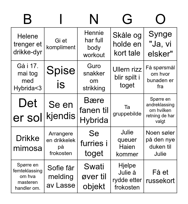 This bingo card has a free space and 24 words: Arrangere en drikkelek på frokosten, Sofie får melding av Lasse, Guro snakker om strikking, Spørre en femteklassing om hva masteren handler om., Synge "Ja, vi elsker", Helene trenger et drikke-dyr, Gå i 17. mai tog med Hybrida<3, Gi et kompliment, Ta gruppebilde, Se furries i toget, Ullern rizz blir spilt i toget, Det er sol, Julie queuer Haien kommer, Noen søler på den nye duken til Julie, Spise is, Hjelpe Julie å rydde etter frokosten, Spørre en andreklassing om hvilken retning de har valgt, Hennie har full body workout, Få spørsmål om hvor bunaden er fra, Se en kjendis, Få et russekort, Drikke mimosa, Skåle og holde en kort tale and Swati øver til objekt.