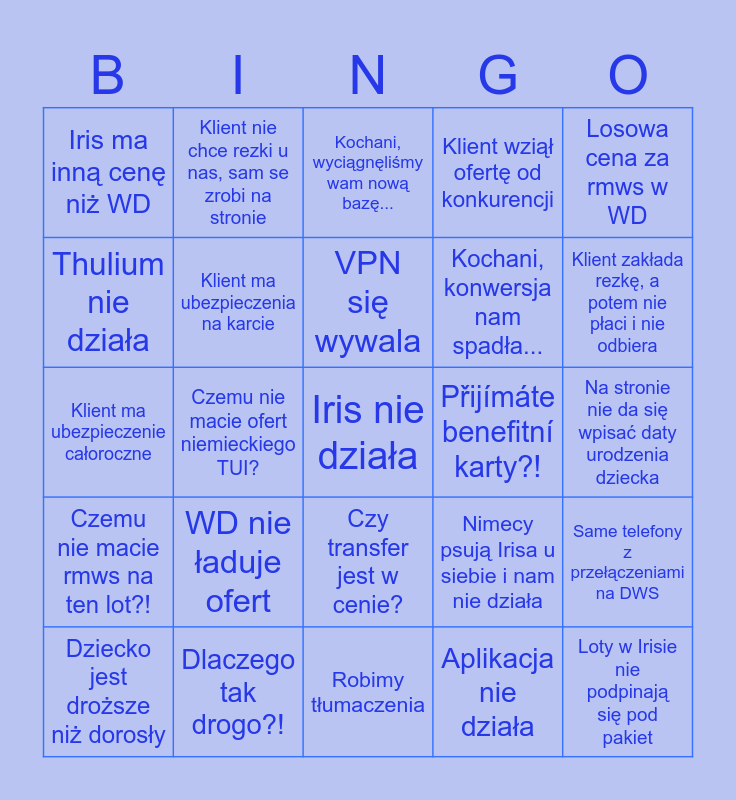 This bingo card has a free space and 24 words: WD nie ładuje ofert, Dlaczego tak drogo?!, VPN się wywala, Dziecko jest droższe niż dorosły, Losowa cena za rmws w WD, Iris ma inną cenę niż WD, Thulium nie działa, Klient nie chce rezki u nas, sam se zrobi na stronie, Přijímáte benefitní karty?!, Czy transfer jest w cenie?, Kochani, konwersja nam spadła..., Klient ma ubezpieczenie całoroczne, Nimecy psują Irisa u siebie i nam nie działa, Same telefony z przełączeniami na DWS, Klient ma ubezpieczenia na karcie, Aplikacja nie działa, Na stronie nie da się wpisać daty urodzenia dziecka, Kochani, wyciągnęliśmy wam nową bazę..., Klient zakłada rezkę, a potem nie płaci i nie odbiera, Czemu nie macie ofert niemieckiego TUI?, Loty w Irisie nie podpinają się pod pakiet, Czemu nie macie rmws na ten lot?!, Klient wziął ofertę od konkurencji and Robimy tłumaczenia.