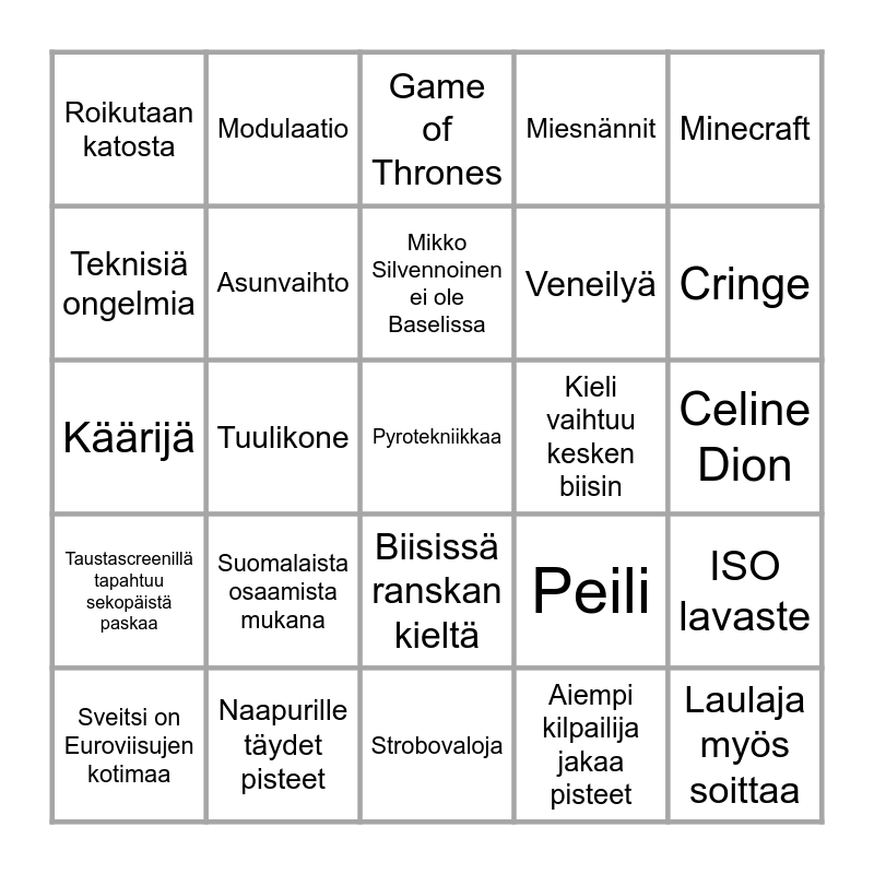 This bingo card has 25 words: Suomalaista osaamista mukana, Strobovaloja, Mikko Silvennoinen ei ole Baselissa, Sveitsi on Euroviisujen kotimaa, Minecraft, Roikutaan katosta, Teknisiä ongelmia, Modulaatio, Kieli vaihtuu kesken biisin, Biisissä ranskan kieltä, Veneilyä, Käärijä, Peili, ISO lavaste, Asunvaihto, Laulaja myös soittaa, Celine Dion, Game of Thrones, Cringe, Tuulikone, Pyrotekniikkaa, Naapurille täydet pisteet, Taustascreenillä tapahtuu sekopäistä paskaa, Miesnännit and Aiempi kilpailija jakaa pisteet.