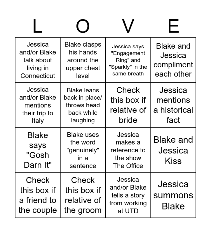 This bingo card has 19 words: Jessica makes a reference to the show The Office, Jessica refers to Theo as "Just a baby", Jessica says "Engagement Ring" and "Sparkly" in the same breath, Jessica summons Blake, Blake and Jessica Kiss, Jessica and/or Blake mentions their trip to Italy, Jessica and/or Blake tells a story from working at UTD, Jessica and/or Blake talk about living in Connecticut, Blake clasps his hands around the upper chest level, Blake says "Gosh Darn It", Blake uses the word "genuinely" in a sentence, Blake leans back in place/ throws head back while laughing, Check this box if relative of bride, Check this box if relative of the groom, Check this box if a friend to the couple, Check this box if a country song comes on, Blake and Jessica compliment each other, Jessica mentions a historical fact and Blake mentions the gym or running a 5k.