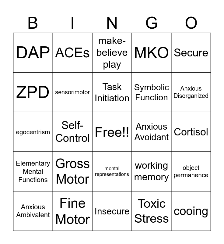 This bingo card has a free space and 24 words: Anxious Ambivalent, Gross Motor, Task Initiation, Toxic Stress, Secure, DAP, ACEs, make-believe play, Anxious Avoidant, Cortisol, egocentrism, sensorimotor, working memory, object permanence, ZPD, Fine Motor, Insecure, MKO, Anxious Disorganized, Elementary Mental Functions, Self-Control, mental representations, Symbolic Function and cooing.