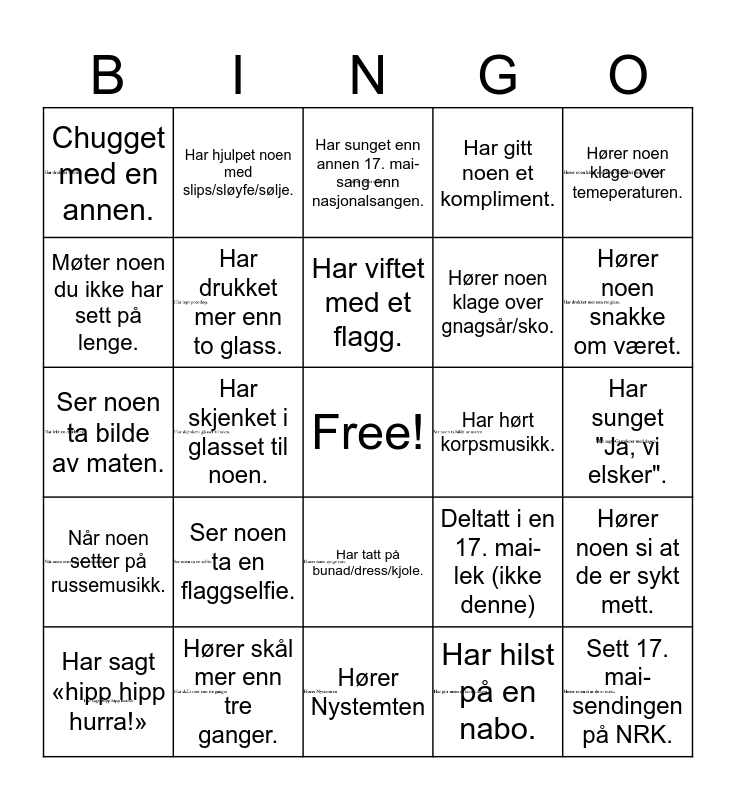 This bingo card has 19 images, a free space and 29 words: Har sagt «hipp hipp hurra!», Har spist kake., Har skjenket i glasset til noen., Har tatt en shot., Chugget med en annen., Har sunget enn annen 17. mai-sang enn nasjonalsangen., Har drukket mer enn to glass., Ser noen ta en flaggselfie., Har hørt korpsmusikk., Hører skål mer enn tre ganger., Har sunget "Ja, vi elsker"., Sett 17. mai-sendingen på NRK., Hører Nystemten, Har hilst på en nabo., Hører noen snakke om været., Har poppet en flaske musserende., Har tatt på bunad/dress/kjole., Når noen setter på russemusikk., Hører noen klage over temeperaturen., Ser noen ta bilde av maten., Deltatt i en 17. mai-lek (ikke denne), Ser noen justere bunaden sin., Hører noen klage over gnagsår/sko., Møter noen du ikke har sett på lenge., Har gitt noen et kompliment., Har hjulpet noen med slips/sløyfe/sølje., Hører noen si at de er sykt mett., Har viftet med et flagg. and Når noen søler..