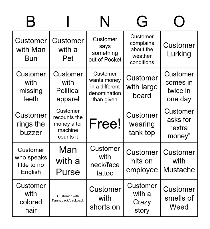 This bingo card has a free space and 57 words: These are nice pens, Customer with colored hair, Customer with Buzzcut, Customer with Man Bun, Customer with shorts on, Customer with Shirt tucked into shorts, Customer with Political apparel, Bald Customer, Customer with large beard, Customer wearing something WAY too short, Customer complains about the weather conditions, Customer mentions Caeser Pen Holder, Customer with sunglasses indoors, Customer wants to cash 5000+, Customer needs a debit card ordered, Customer admits about stealing Pens, Customer Lurking, Customer recounts the money after machine counts it, Customer smells of Alcohol, Customer smells of Weed, Customer wearing tank top, Customer wearing clothes a few sizes too small, Customer hits on employee, Customer says something out of Pocket, Customer asks where the ATM is, Customer wants money in a different denomination than given, Customer walks directly to teller line or into an office unprovoked, Customer is confused about something extremely simple, Customer comes in twice in one day, Customer talking on the Phone, Customer wants to talk to one of the “Managers”, Customer doesn’t say anything except “Thank you” for the whole transaction, Customer needs to use the bathroom, Customer with a wandering Child, Customer asks for “extra money”, Customer with missing teeth, Customer over 6’5, Customer rings the buzzer, Customer with thick accent, Customer who speaks little to no English, Customer with a Pet, Customer with neck/face tattoo, Customer with a cane, Customer with Umbrella, Customer sopping wet, Customer with manilla envelope, Man with a Purse, Customer with Fannypack/backpack, Customer wearing too much apparel for weather, Customer sits in lobby without saying anything, Customer at teller line staring at Bankers, Customer with a Crazy story, Customer in Slippers, Customer with Pajama pants on, Customer with sweatshirt, Customer with Mustache and Customer with a Big hat.
