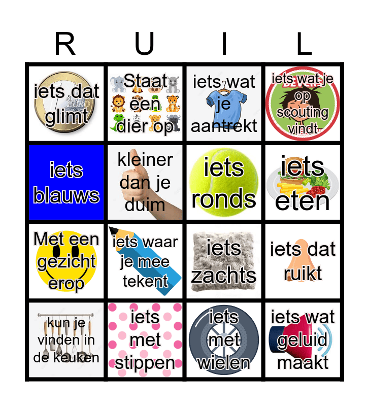This bingo card has 16 images and 16 words: iets met stippen, iets dat ruikt, iets wat je aantrekt, iets dat glimt, Met een gezicht erop, Staat een dier op, iets zachts, iets met wielen, iets blauws, kleiner dan je duim, kun je vinden in de keuken, iets wat je op scouting vindt, iets waar je mee tekent, iets eten, iets ronds and iets wat geluid maakt.