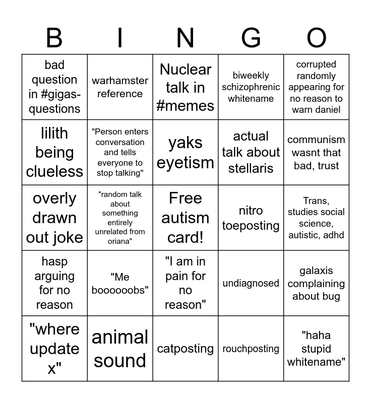 This bingo card has a free space and 29 words: "where update x", "overflow", "random talk about something entirely unrelated from oriana", pig talking about something out of pocket, bad question in #gigas-questions, Nuclear talk in #memes, "Person enters conversation and tells everyone to stop talking", "Me boooooobs", nitro toeposting, animal sound, Trans, studies social science, autistic, adhd, "haha stupid whitename", catposting, rouchposting, communism wasnt that bad, trust, acot bad, "I am in pain for no reason", hasp arguing for no reason, corrupted randomly appearing for no reason to warn daniel, overly drawn out joke, undiagnosed, boy i wonder who made that new modmail, actual talk about stellaris, lilith being clueless, biweekly schizophrenic whitename, warhamster reference, galaxis complaining about bug, yaks eyetism and femboy react gifs.