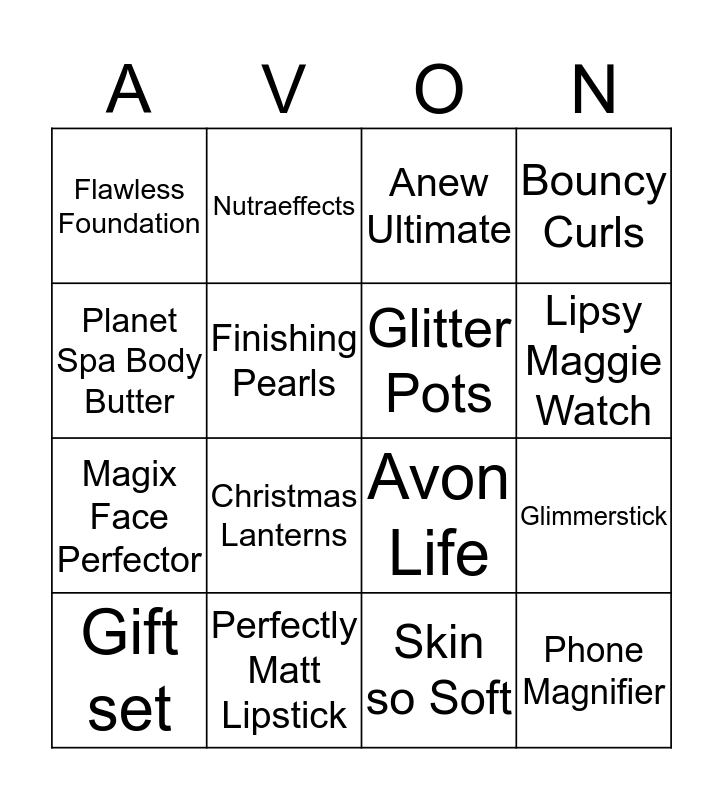 This bingo card has 16 words: Perfectly Matt Lipstick, Glimmerstick, Anew Ultimate, Flawless Foundation, Magix Face Perfector, Nutraeffects, Avon Life, Skin so Soft, Planet Spa Body Butter, Finishing Pearls, Gift set, Bouncy Curls, Christmas Lanterns, Lipsy Maggie Watch, Glitter Pots and Phone Magnifier.