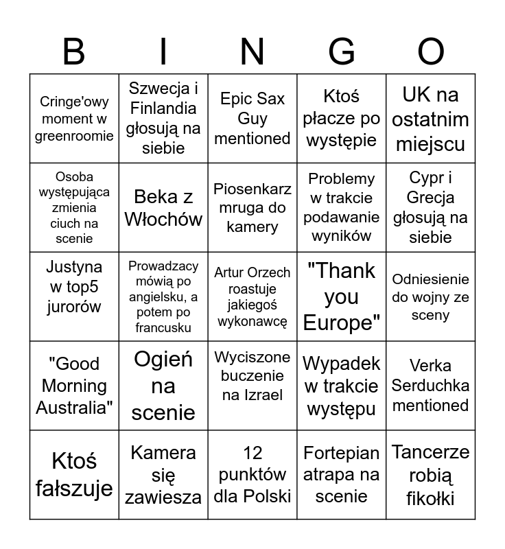 This bingo card has 25 words: "Good Morning Australia", Kamera się zawiesza, Artur Orzech roastuje jakiegoś wykonawcę, Fortepian atrapa na scenie, UK na ostatnim miejscu, Cringe'owy moment w greenroomie, Szwecja i Finlandia głosują na siebie, Epic Sax Guy mentioned, "Thank you Europe", Verka Serduchka mentioned, Osoba występująca zmienia ciuch na scenie, Beka z Włochów, 12 punktów dla Polski, Wypadek w trakcie występu, Cypr i Grecja głosują na siebie, Ktoś fałszuje, Prowadzacy mówią po angielsku, a potem po francusku, Piosenkarz mruga do kamery, Problemy w trakcie podawanie wyników, Odniesienie do wojny ze sceny, Justyna w top5 jurorów, Ogień na scenie, Wyciszone buczenie na Izrael, Ktoś płacze po występie and Tancerze robią fikołki.