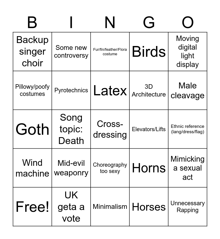 This bingo card has 29 words: Free!, Song topic: Capes, Song topic: Death, Unnecessary Rapping, Backup singer choir, Fur/fin/feather/Flora costume, Pyrotechnics, Mid-evil weaponry, Elevators/Lifts, UK geta a vote, Ethnic reference (lang/dress/flag), Cross-dressing, Minimalism, Horses, Male cleavage, Sparkle shorts, Choreography too sexy, Wind machine, Moving digital light display, Goth, Horns, Song topic: nationalism, 3D Architecture, Pillowy/poofy costumes, Birds, Some new controversy, Mimicking a sexual act, Latex and Monochromatic set and costume.