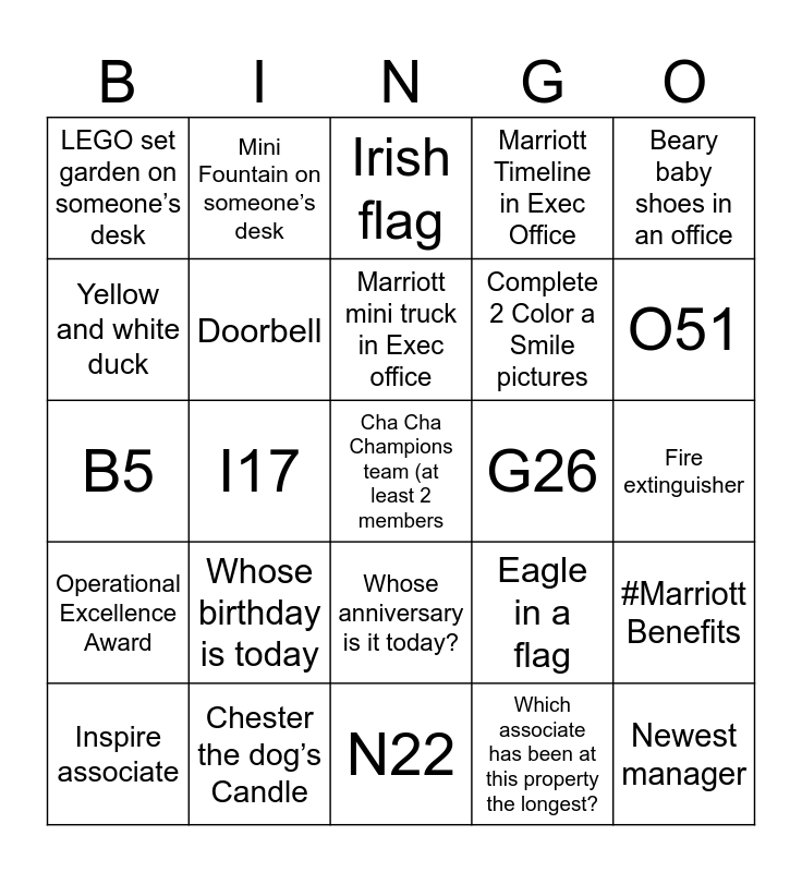 This bingo card has a free space and 24 words: Inspire associate, Whose birthday is today, Marriott mini truck in Exec office, Which associate has been at this property the longest?, Beary baby shoes in an office, LEGO set garden on someone’s desk, Mini Fountain on someone’s desk, Irish flag, G26, Fire extinguisher, B5, Doorbell, Eagle in a flag, #Marriott Benefits, Yellow and white duck, Chester the dog’s Candle, N22, Marriott Timeline in Exec Office, O51, Operational Excellence Award, I17, Whose anniversary is it today?, Complete 2 Color a Smile pictures and Newest manager.