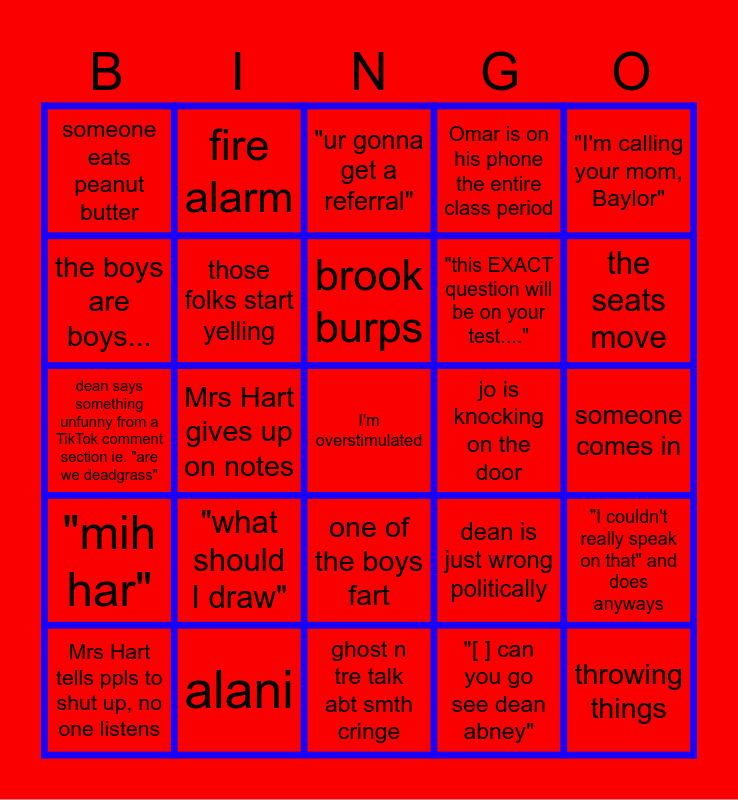 This bingo card has a free space and 39 words: dean n omar talk politics, "I will say this", "in the sense that...", those folks start yelling, Mrs Hart tells ppls to shut up, no one listens, one of the boys fart, brook burps, the lights get turned off, "I'm calling your mom, Baylor", "mih har", Mrs Hart gives up on notes, Omar is on his phone the entire class period, throwing things, someone comes in, jo is knocking on the door, "what should I draw", Madison brings tea or a monster, someone eats peanut butter, Mrs Hart gets hurt/sick, dean is just wrong politically, the boys are boys..., ghost n tre talk abt smth cringe, "this EXACT question will be on your test....", the seats move, mrs Hart crash out, Mrs Hart leaves the room, someones youtube plays outloud, chromebook smoking, dean says something cancellable, fire alarm, Mrs Hart does something that has potential to get her fired, one of the boys has to leave and suddenly they're all gone, "ur gonna get a referral", alani, "[ ] can you go see dean abney", "oh my God" from neptune, "I couldn't really speak on that" and does anyways, dean says something unfunny from a TikTok comment section ie. "are we deadgrass" and J.O. is the only one responding/paying attention to Mrs Hart.