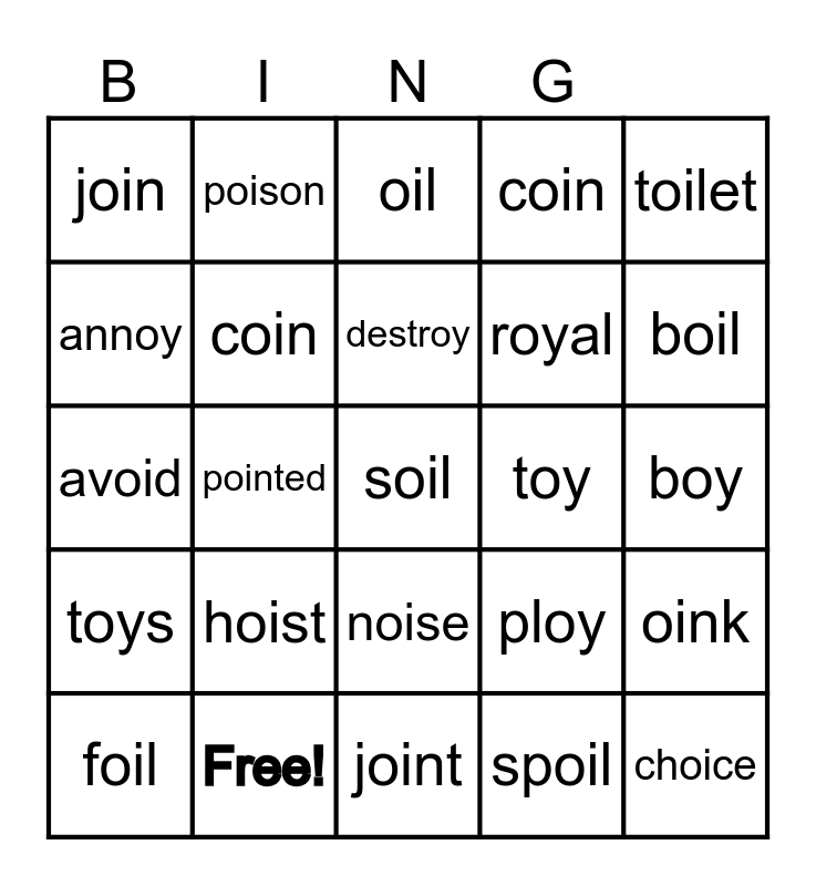 This bingo card has 30 words: Free!, joy, pointed, voice, join, oil, coin, noise, toy, joint, boy, soil, spoil, choice, boil, moist, ploy, toys, hoist, toilet, avoid, voyage, poison, royal, annoy, coin, oink, foil, destroy and avoid.