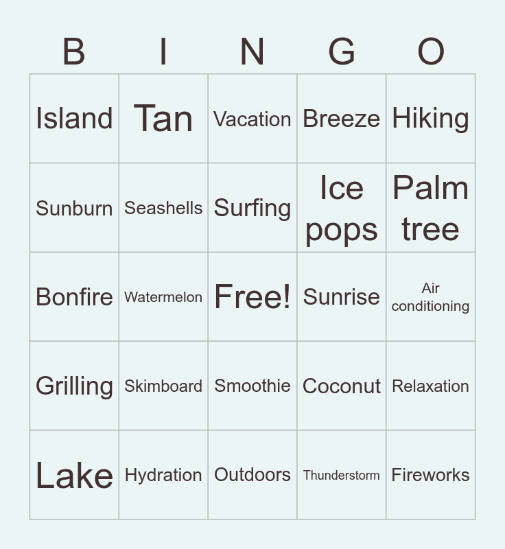 This bingo card has a free space and 75 words: Sunshine, Beach, Vacation, Heat, Ice cream, Pool, Barbecue, Flip-flops, Sunglasses, Swimsuit, Sand, Ocean, Surfing, Sunburn, Hammock, Watermelon, Lemonade, Fireworks, Camping, Hiking, Road trip, Bonfire, Seashells, Tan, Breeze, Lifeguard, Paddleboard, Snorkeling, Jet ski, Picnic, Frisbee, Volleyball, Sunscreen, Coconut, Palm tree, Ice pops, Shorts, Tank top, Air conditioning, Thunderstorm, Lightning bugs, Starry nights, Fishing, Boating, Kayaking, Canoe, Lake, Island, Cruise, Tropical, Margarita, Smoothie, Festival, Parade, Carnival, Amusement park, Rollercoaster, Sandcastle, Towel, Beach ball, Skimboard, Diving, Splash, Breeze, Sunset, Sunrise, Travel, Adventure, Freedom, Relaxation, Grilling, Hydration, Nature, Outdoors and Fun.