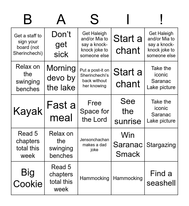 ⚠ This card has duplicate items: Big Cookie (5), Dance (3), Get a staff to sign your board (not Sherinchechi) (3), Pray with someone new (3), Selfie with 10 students in one picture (3), Pictures of all the other contestants without them noticing (3), Read 5 chapters total this week (3), Jensonchachan makes a dad joke (3), Win Saranac Smack (3), Play Frisbee (3), Fast a meal (3), Gift someone something from the shop (3), Morning devo by the lake (3), Take the iconic Saranac Lake picture (3), Find a seashell (3), Don’t get sick (3), Hammocking (3), Relax on the swinging benches (3), Stargazing (3), See the sunrise (3), Put a post-it on Sherinchechi’s back without her knowing (3), Start a chant (3), Get Haleigh and/or Mia to say a knock-knock joke to someone else (3), Kayak (2)