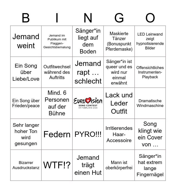This bingo card has a free space and 34 words: Breakdance Performance, Mann ist oberkörperfrei, Exzessive Verwendung von Glitzer, Konfetti-Kanone, Sehr langer hoher Ton wird gesungen, Outfitwechsel während des Auftritts, LED Leinwand zeigt hypnotisierende Bilder, Bizarrer Ausdruckstanz, Jemand im Publikum mit Flaggen-Gesichtsbemalung, Schulterpolster, Jemand rapt … schlecht, Sänger*in liegt auf dem Boden, Pailletten-kleid, *zwinker*, Lack und Leder Outfit, Offensichtliches Instrumenten-Playback, WTF!?, Ein Song über Frieden/peace, Federn, Irritierendes Haar-Accessoire, PYRO!!!, Traditionelles Instrument, Jemand weint, Dramatische Windmaschine, Jemand trägt einen Hut, Sänger*in hat extrem lange Fingernägel, Maskierte Tänzer (Bonuspunkt Pferdemaske), Fake Regen, Sänger*in ist queer und es wird nur einmal erwähnt, Ein Song über Liebe/Love, Jemand trägt drinnen Sonnenbrille, Mind. 6 Personen auf der Bühne, Song klingt wie ein Cover von … and Gefärbte Haare.