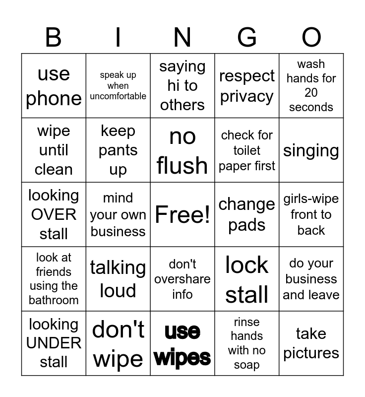 This bingo card has a free space and 24 words: talking loud, don't wipe, no flush, looking UNDER stall, wash hands for 20 seconds, use phone, wipe until clean, speak up when uncomfortable, change pads, don't overshare info, check for toilet paper first, looking OVER stall, lock stall, do your business and leave, keep pants up, rinse hands with no soap, girls-wipe front to back, saying hi to others, singing, mind your own business, take pictures, look at friends using the bathroom, respect privacy and use wipes.