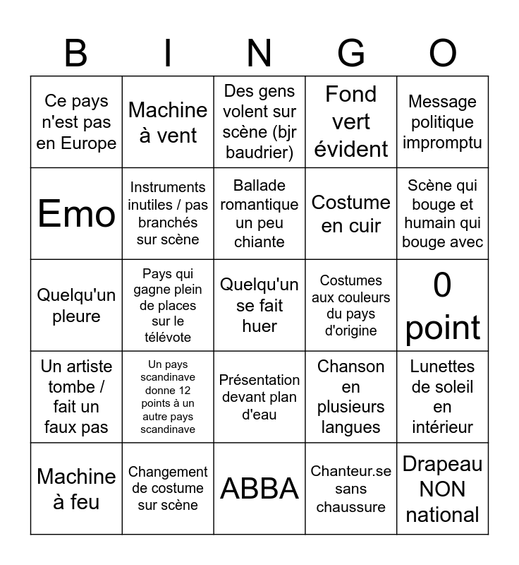 This bingo card has a free space and 32 words: Chanteur.se sans chaussure, Chanteur.se arrache son haut, Pays qui gagne plein de places sur le télévote, Clin d’œil caméra, Un artiste tombe / fait un faux pas, Instruments inutiles / pas branchés sur scène, Message politique impromptu, Lunettes de soleil en intérieur, Machine à vent, Dub-dub-dub... dubstep drop, Ballade romantique un peu chiante, Des gens volent sur scène (bjr baudrier), Tension sexuelle entre les performeurs, Accessoire démesuré, Costumes aux couleurs du pays d'origine, Fausse pluie, Machine à feu, Quelqu'un pleure, Présentation devant plan d'eau, Un pays scandinave donne 12 points à un autre pays scandinave, Chanson en plusieurs langues, Random saltos, 0 point, Changement de costume sur scène, Drapeau NON national, Fond vert évident, Costume en cuir, Emo, Ce pays n'est pas en Europe, ABBA, Lumière épileptique and Scène qui bouge et humain qui bouge avec.