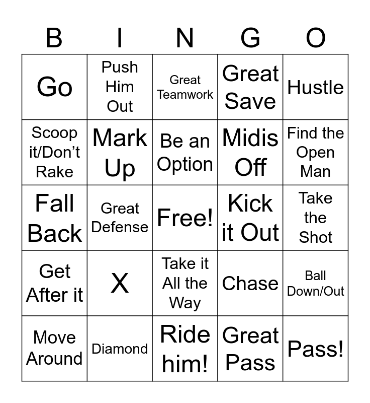 This bingo card has a free space and 24 words: X, Diamond, Be an Option, Move Around, Hustle, Go, Scoop it/Don’t Rake, Push Him Out, Kick it Out, Take it All the Way, Midis Off, Fall Back, Chase, Ball Down/Out, Mark Up, Great Pass, Take the Shot, Great Teamwork, Find the Open Man, Great Defense, Pass!, Get After it, Great Save and Ride him!.