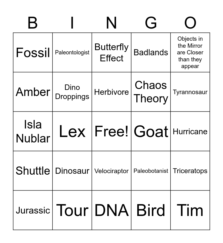 This bingo card has a free space and 25 words: Dinosaur, DNA, Herbivore, Jurassic, Objects in the Mirror are Closer than they appear, Fossil, Amber, Paleontologist, Goat, Velociraptor, Chaos Theory, Isla Nublar, Paleobotanist, Triceratops, Dino Droppings, Toxicity, Hurricane, Butterfly Effect, Tyrannosaur, Lex, Tim, Tour, Shuttle, Badlands and Bird.