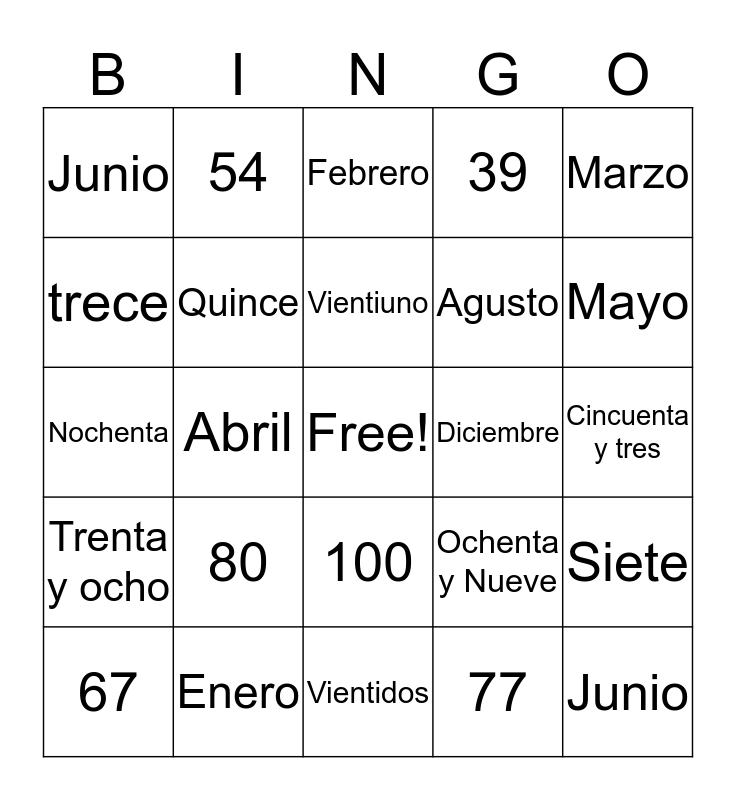 This bingo card has a free space and 24 words: 80, Enero, Vientiuno, 67, Marzo, Junio, trece, 54, Diciembre, 100, Agusto, Nochenta, Ochenta y Nueve, Siete, Quince, 77, Cincuenta y tres, Febrero, Mayo, Abril, Junio, Trenta y ocho, 39 and Vientidos.