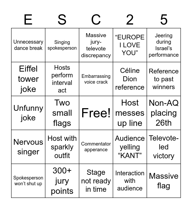 This bingo card has a free space and 24 words: Host with sparkly outfit, 300+ jury points, Embarrassing voice crack, Spokesperson won’t shut up, Jeering during Israel’s performance, Unnecessary dance break, Eiffel tower joke, Singing spokesperson, Host messes up line, Commentator apperance, Céline Dion reference, Unfunny joke, Audience yelling “KANT”, Televote-led victory, Hosts perform interval act, Interaction with audience, Non-AQ placing 26th, Massive jury-televote discrepancy, Reference to past winners, Two small flags, Massive flag, Nervous singer, “EUROPE I LOVE YOU” and Stage not ready in time.