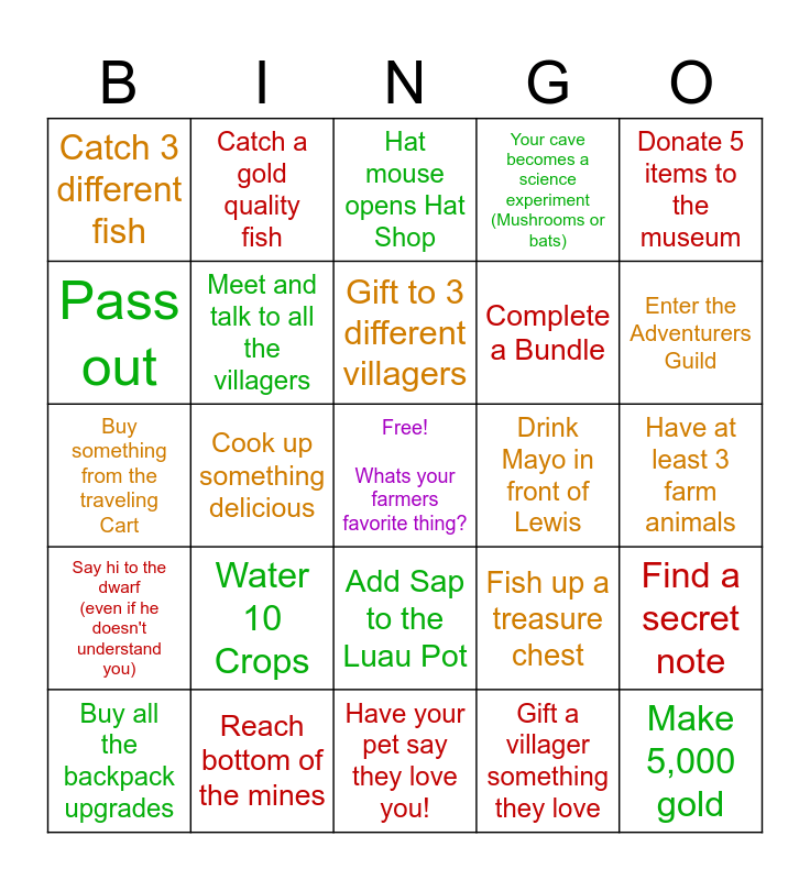 This bingo card has a free space and 24 words: Water 10 Crops, Reach bottom of the mines, Gift to 3 different villagers, Buy all the backpack upgrades, Donate 5 items to the museum, Catch 3 different fish, Pass out, Catch a gold quality fish, Drink Mayo in front of Lewis, Add Sap to the Luau Pot, Complete a Bundle, Buy something from the traveling Cart, Fish up a treasure chest, Find a secret note, Meet and talk to all the villagers, Gift a villager something they love, Have at least 3 farm animals, Hat mouse opens Hat Shop, Enter the Adventurers Guild, Cook up something delicious, Make 5,000 gold, Say hi to the dwarf (even if he doesn't understand you), Your cave becomes a science experiment (Mushrooms or bats) and Have your pet say they love you!.