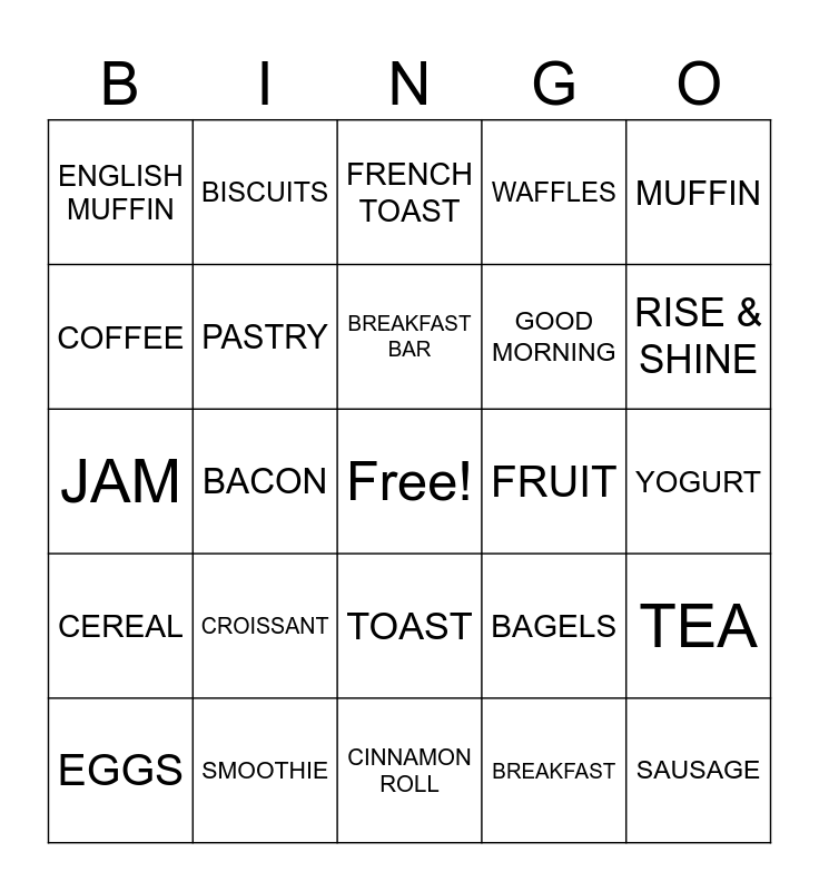 This bingo card has a free space and 39 words: PANCAKES, ORANGE JUICE, APPLE JUICE, PASTRY, EGGS, TOAST, BREAKFAST BAR, DOUGHNUTS, MUFFIN, CEREAL, BACON, WAFFLES, SAUSAGE, YOGURT, FRUIT, CROISSANT, OATMEAL, ENGLISH MUFFIN, MILK, BAGELS, COFFEE, CINNAMON ROLL, GOOD MORNING, RISE & SHINE, READING THE NEWSPAPER, MORNING WALK, SUNSHINE, HAM, QUICHE, BISCUITS, HASH BROWNS, SCONES, FRENCH TOAST, SMOOTHIE, BREAKFAST, HONEY, TEA, JAM and DINER.