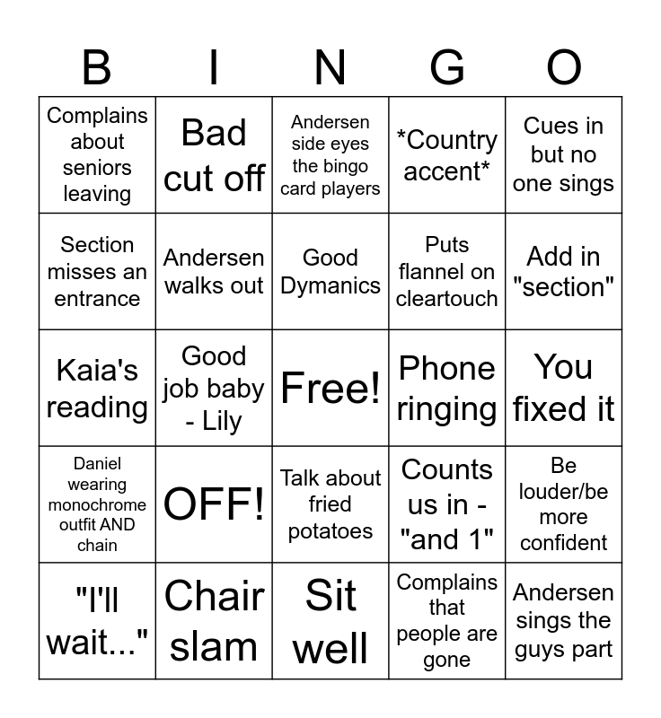 This bingo card has a free space and 52 words: One more time for me, OFF!, Snap from Mom, Yelling, You fixed it, Big hand gestures, Bad cut off, Sheet music falling, Puts flannel on cleartouch, Andersen sings the guys part, Section misses an entrance, Emy says something confusing, Random person (not choir kid) walks in, Be louder/be more confident, "I can't hit that note this morning", Holding a note too long, Good Dymanics, Counts us in - "and 1", "Stand", Complains about seniors leaving, Good job baby - Lily, Daniel drinks milk, *Country accent*, Cues in but no one sings, Rainey's burps, Get up Tissue, Get up drink, Mom snapchat, Add in "section", Daniel wearing monochrome outfit AND chain, Andersen trying to avoid to say anything on a bingo card, Andersen side eyes the bingo card players, Andersen plays keys after messing up, Someone spills something, "I'll wait...", Andersen walks out, Talk about fried potatoes, One more time, Caitlyn late with drink, Andersen stands on chair, Harmonica, Sit well, Complains that people are gone, Chair time, Kaia's reading, Water bottle falls, Squirrel!, Phone ringing, Note Check, Andersen's creepy smile, Chair slam and Andersen tries to make a shot in the garbage can.