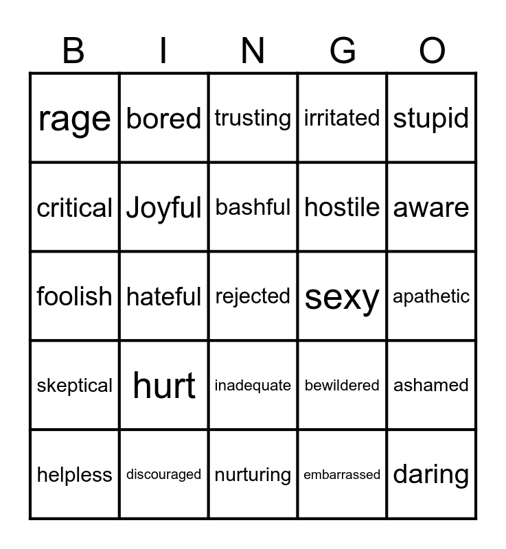 This bingo card has 66 words: Free!, Sad, guilty, ashamed, depressed, lonely, bored, sleepy, bashful, Miserable, inadequate, inferior, apathetic, stupid, Mad, critical, hateful, rage, angry, hostile, hurt, skeptical, irritated, furious, frustrated, selfish, jealous, Scared, rejected, confused, helpless, submissive, insecure, anxious, bewildered, discouraged, insignificant, foolish, embarrassed, weak, Joyful, excited, sexy, energetic, playful, creative, aware, amused, daring, fascinating, stimulating, extravagant, delightful, Peaceful, content, thoughtful, intimidate, loving, trusting, nurturing, pensive, relaxed, responsive, sentimental, thankful and serene.