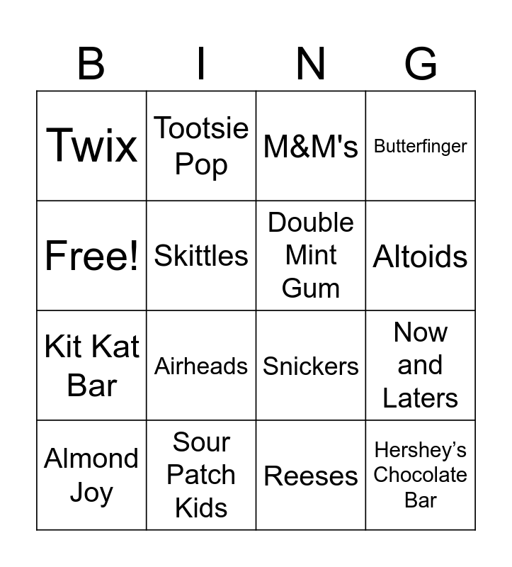 This bingo card has 16 words: Sour Patch Kids, Now and Laters, M&M's, Twix, Kit Kat Bar, Tootsie Pop, Snickers, Reeses, Free!, Skittles, Almond Joy, Butterfinger, Airheads, Altoids, Double Mint Gum and Hershey’s Chocolate Bar.